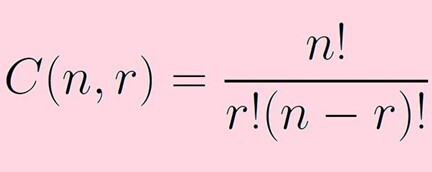 The number of combinations of r objects from n is given by C(n, r) = n! / (r!(n - r)!)