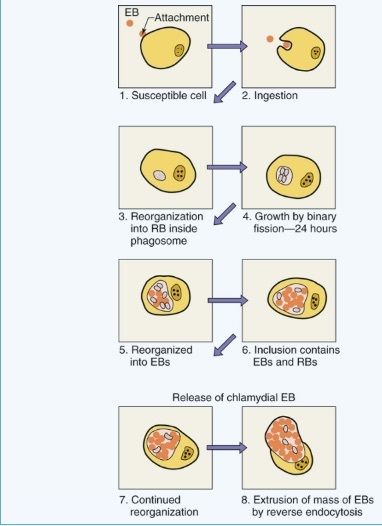 Elementærlegemet sætter sig fast på værtscellen -> laver en aktiv penetration af værtscellen -> internaliseres og bakterien bliver inde i cytoplasmatiske fagosomer= vakuoler -> bakterien i vakuole beskyttes herved mod cellulære lysosomer, hvis den ydre membran på EB er intakt. Efter 6-8 timer omdannes elementærlegemet til retikulærlegemet -> retikulærlegemet replikerer ved binær fission -> efter 18-24 timer omdannes de nydannede retikulærlegemer til elementær legemer -> 48-72 timer senere dør cellen ved ruptur, og der frigives infektiøse chlamydiabakterier=elementærlegemer —-> ny cyklus