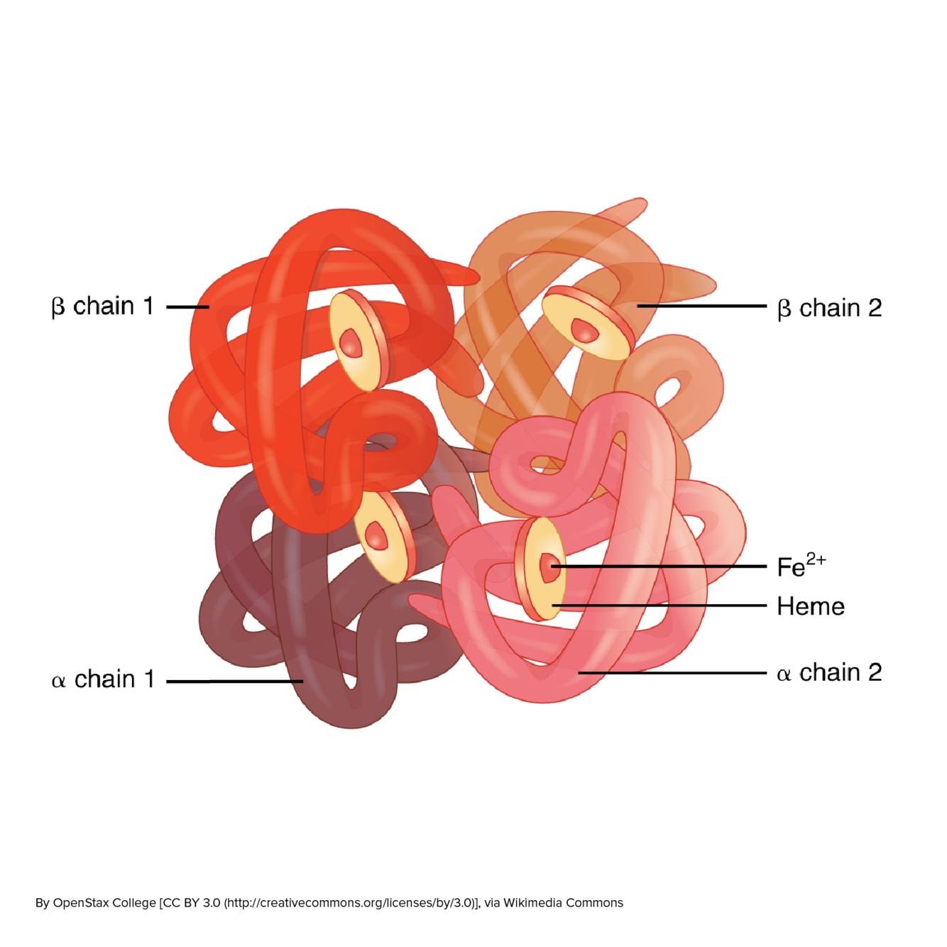 Hemoglobin has four protein subunits, each composed of a heme group and a globin protein. Together, these monomers form a hemoglobin tetramer.