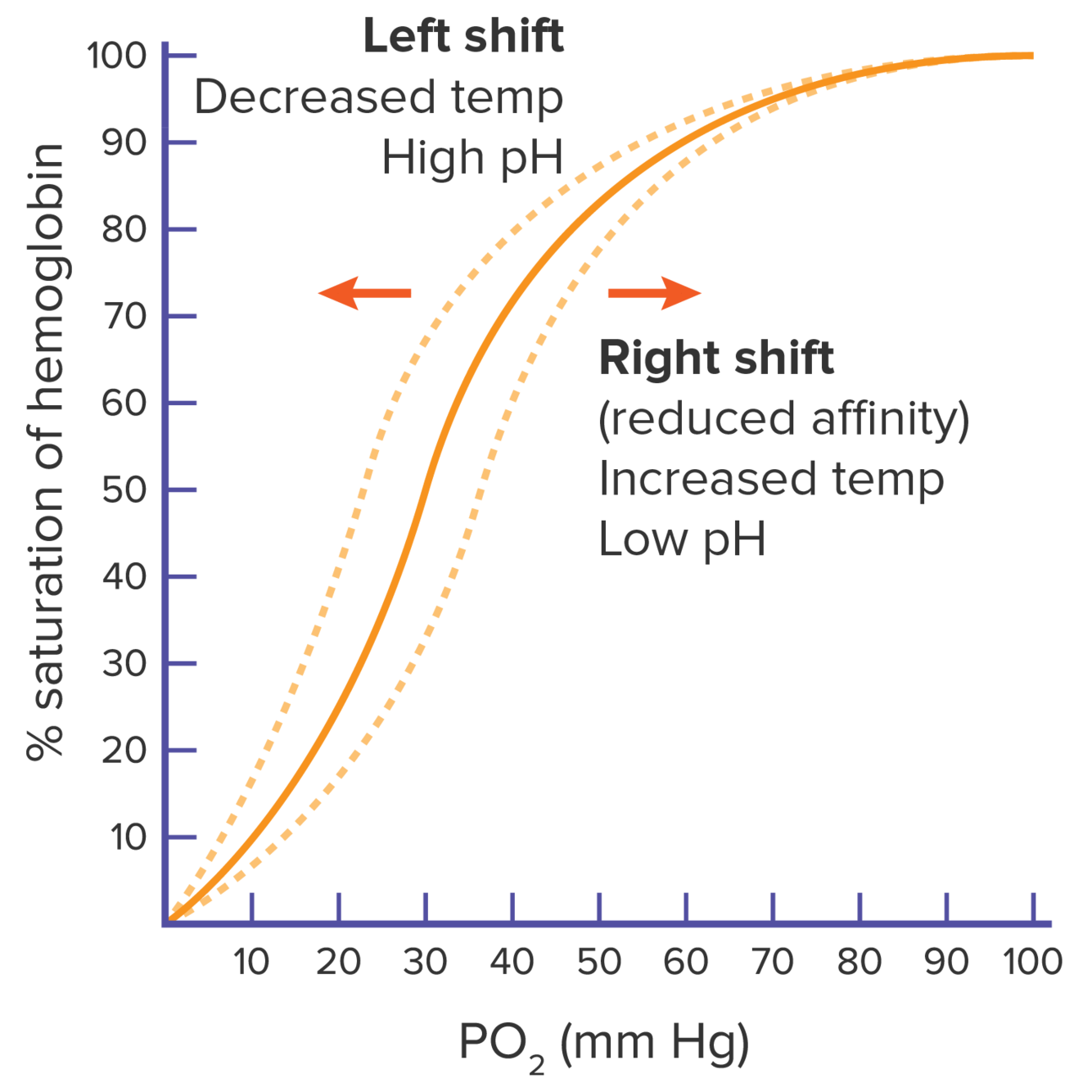 High temperature, low pH, and high carbon dioxide concentration lower the oxygen affinity of hemoglobin. This decrease allows oxygen to be more easily released to body tissue.