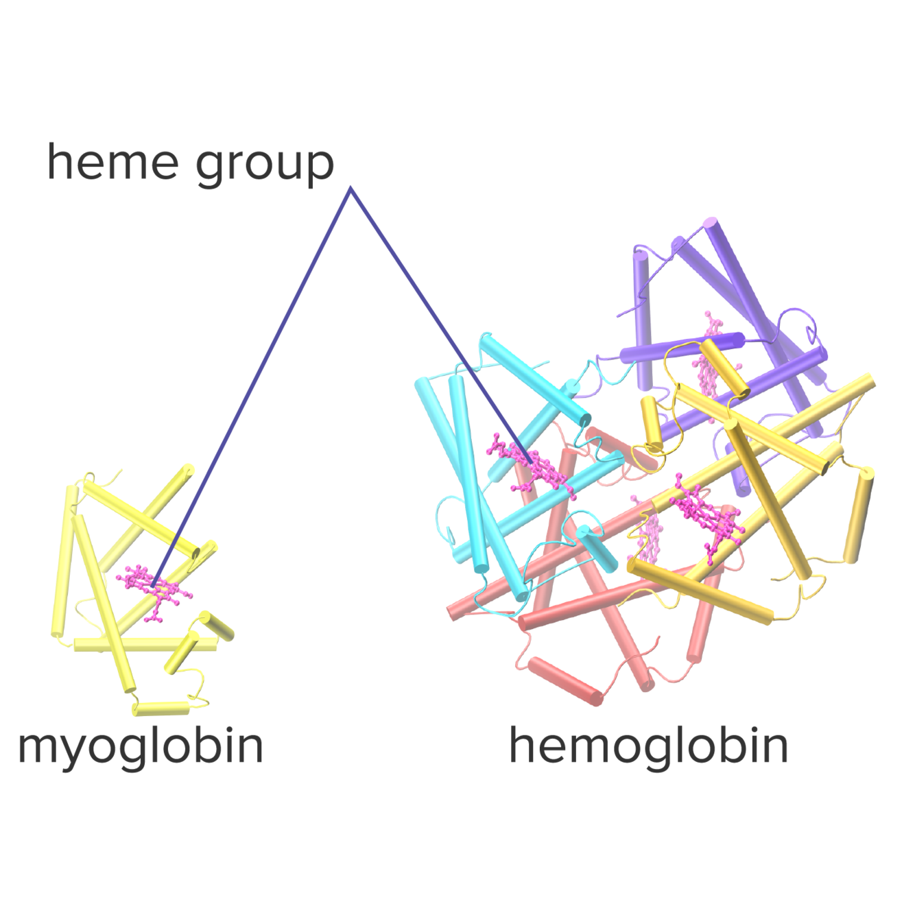Myoglobin is the iron-containing protein that binds oxygen in skeletal muscle cells. It is closely related to hemoglobin, but contains only one monomer instead of four.