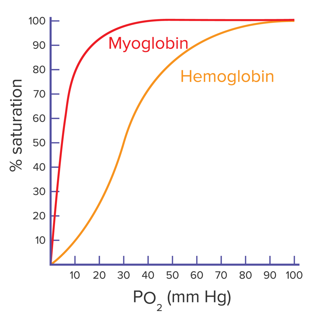 The oxygen binding curve of myoglobin is hyperbolic. For the MCAT, it is most important to know that unlike hemoglobin, it is not sigmoidal.