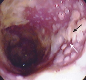 Pseudomembranosus colitis (værste forløb) efter langvarig antibiotisk behandling, hvor normalfloraen er nedsat og opformering af resistente og virulente (forøget toxinproduktion grundet intet gen til at regulere) c. difficile ses. Diarré er blodig. er dog sjældent. Diarré er voldsom, man har mavekramper og feber og hvide belægninger (pseudomembraner) på intakt væv.
