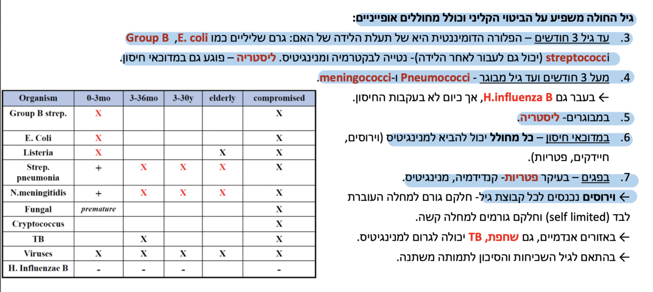 אילו אטיולוגיות למנינגיטיס תואמות לאיזה גיל?