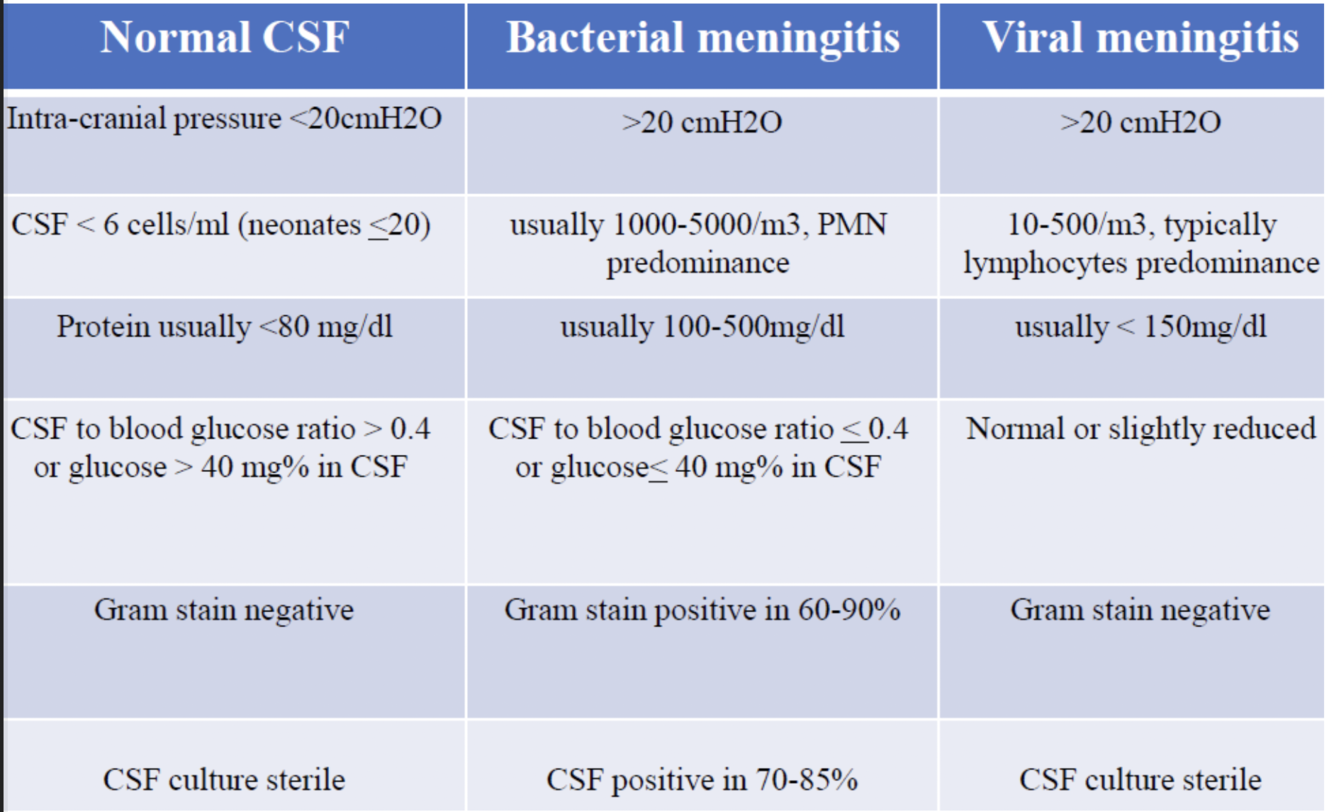 במנינגיטיס חיידקי- סוכר נמוך, חלבון גבוה, ספירה לבנה גבוה עם בעיקר נויטרופילים.