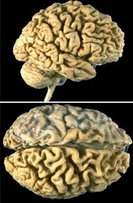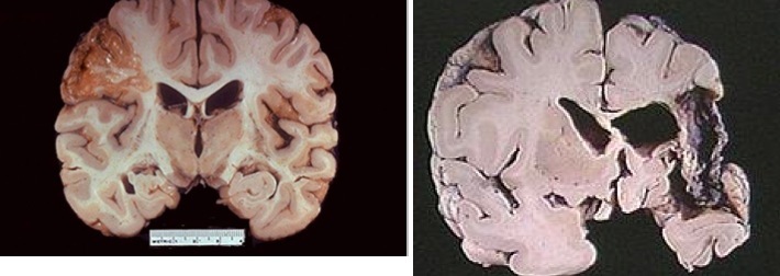 – atrophy, esp. frontal, temporal, parietal (apraxia)