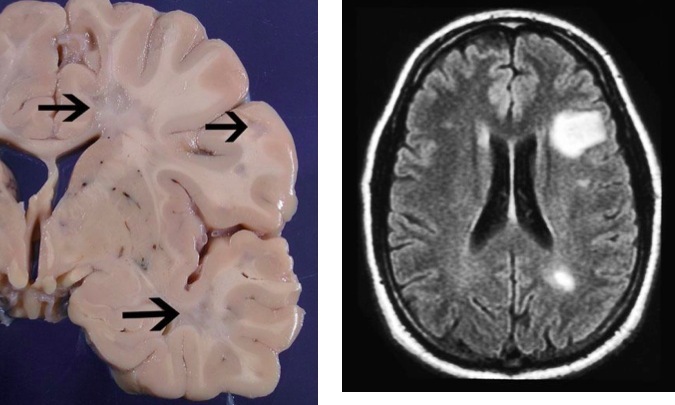 – demyelination (patchy loss of myelin): grey & white matter *