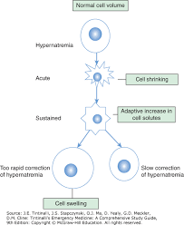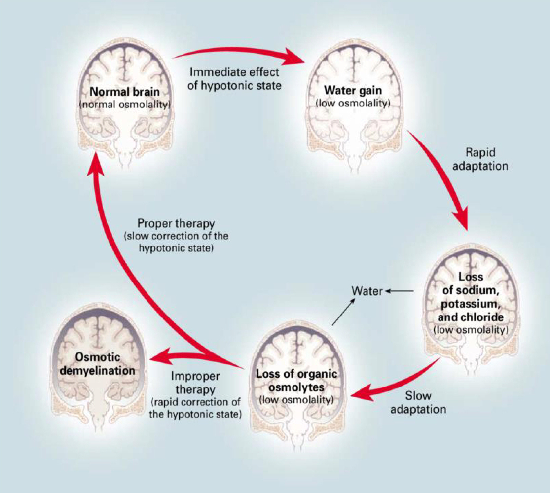 water uptake exceeds accumulated electrolytes and osmolites, causing cells to swell and CNS impairment