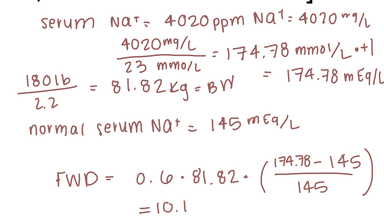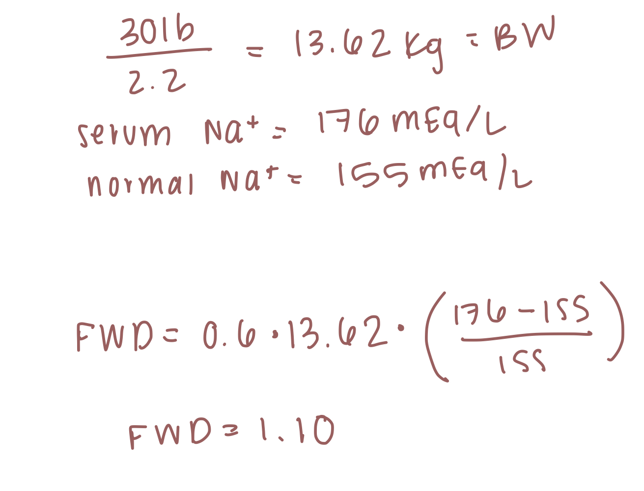 A 30-lb dog presents with a serum Na+ level of 176 mEq/L. If the normal serum Na+ level for dogs is 155 mEq/L, calculate the free water deficit.