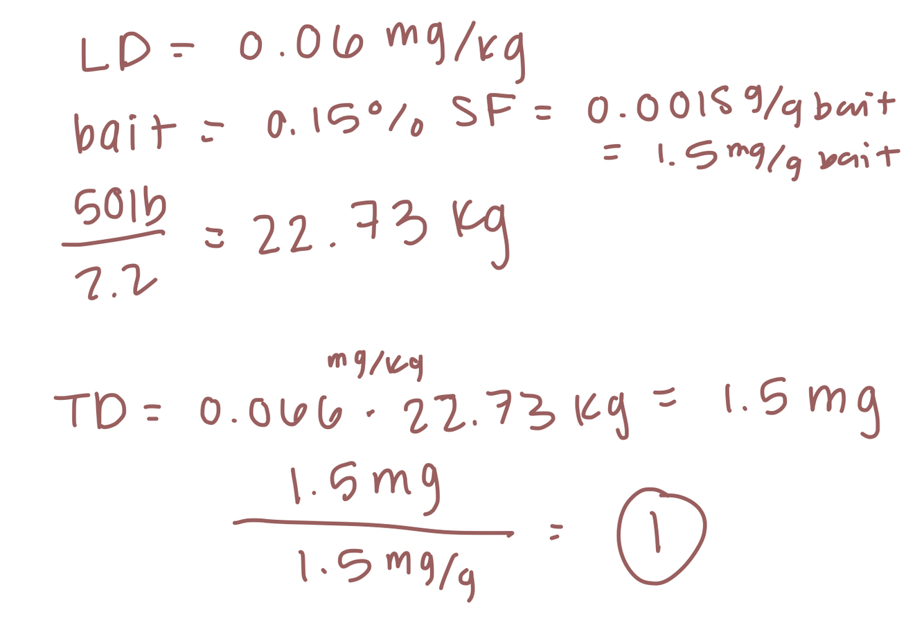 The oral LD50 for sodium fluoroacetate in dogs is 0.066-0.35 mg/kg. If field rodent bait contains 0.15% sodium fluoroacetate, how much would a 50-lb dog need to consume to attain the LD50?