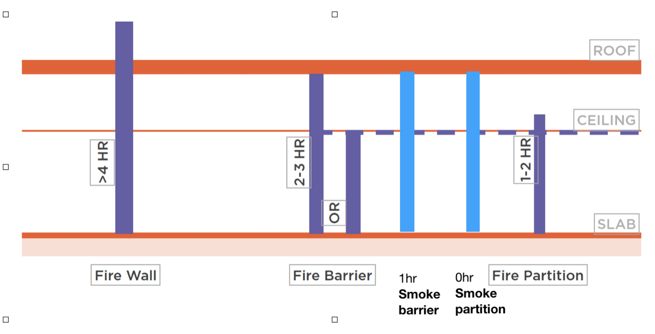 Vertical or horizontal assembly, that is fire-resistance rated, designed to restrict the spread of fire and smoke, and afford safe passage for protected egress. Continuous from floor to slab. Used to separate occupancies, enclose vertical exits and passageways. Rating greater than 1 hour, openings 45minto 3h, depending on barrier itself. Openings 25% of walll max, not to exceed 156 ft2.