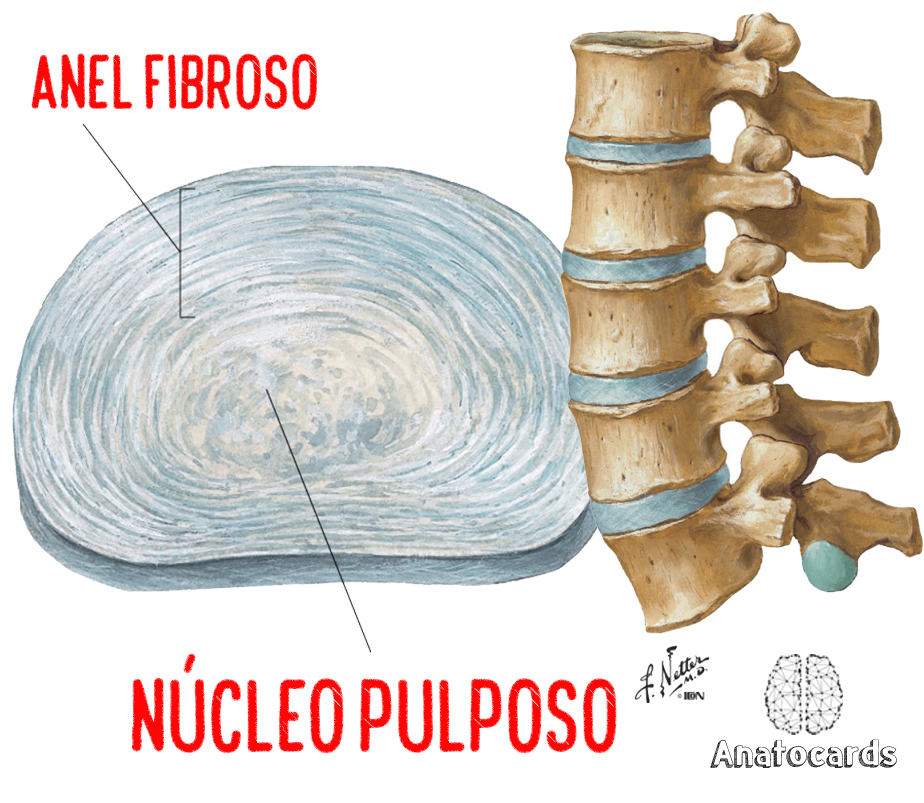 São constituídos por um disco fibroso periférico composto por tecido fibrocartilaginoso, chamado ANEL FIBROSO; e uma substância interna, elástica e macia, chamada NÚCLEO PULPOSO. Os discos formam fortes articulações, permitem vários movimentos da coluna vertebral e absorvem os impactos.