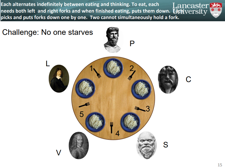 Each picks up an available fork, then checks for the other fork.