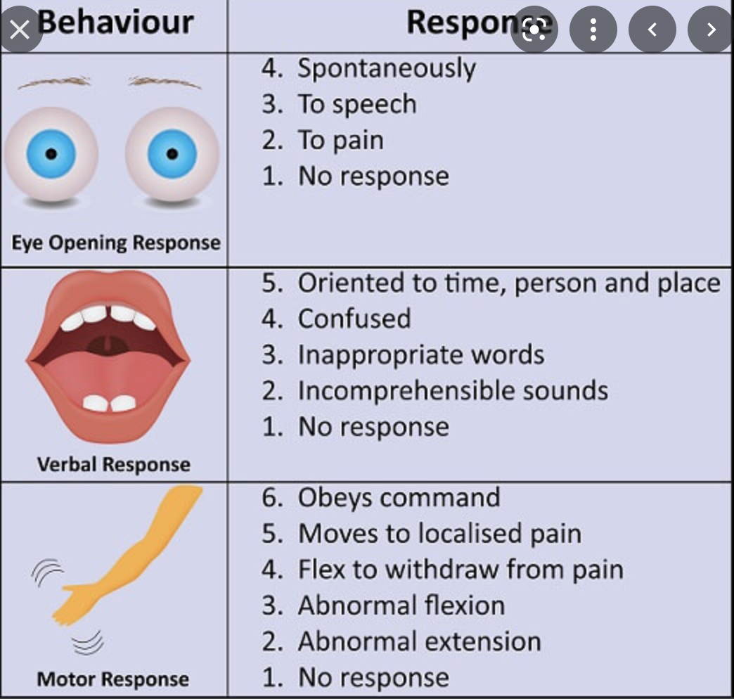 • 4 for eyes + 5 for verbal + 6 motor response = 15