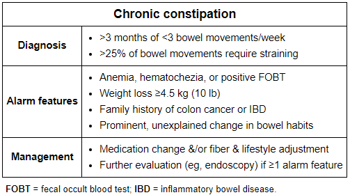 medication change or fiber or lifestyle adjustment and further evaluation (colonoscopy, EGD) if >1 alarm feature