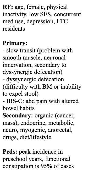 Describe the RF and etiology of constipation
