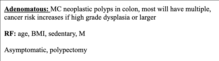 Types: inflammatory, hamartomatous, sessile, adenomatous (neoplastic), etc.