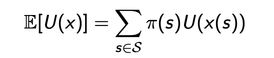 If outcomes are uncertain (given by random variable x), we weight utilities for different outcome realizations by their probabilities, leading to expected utility: