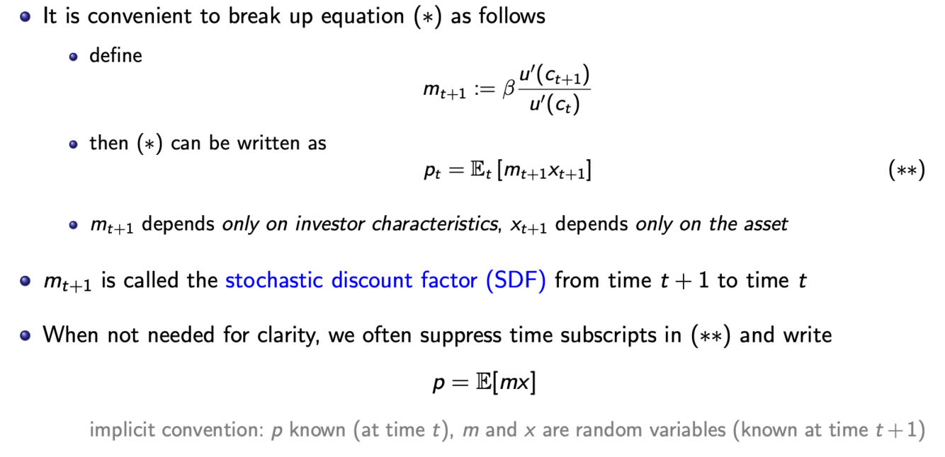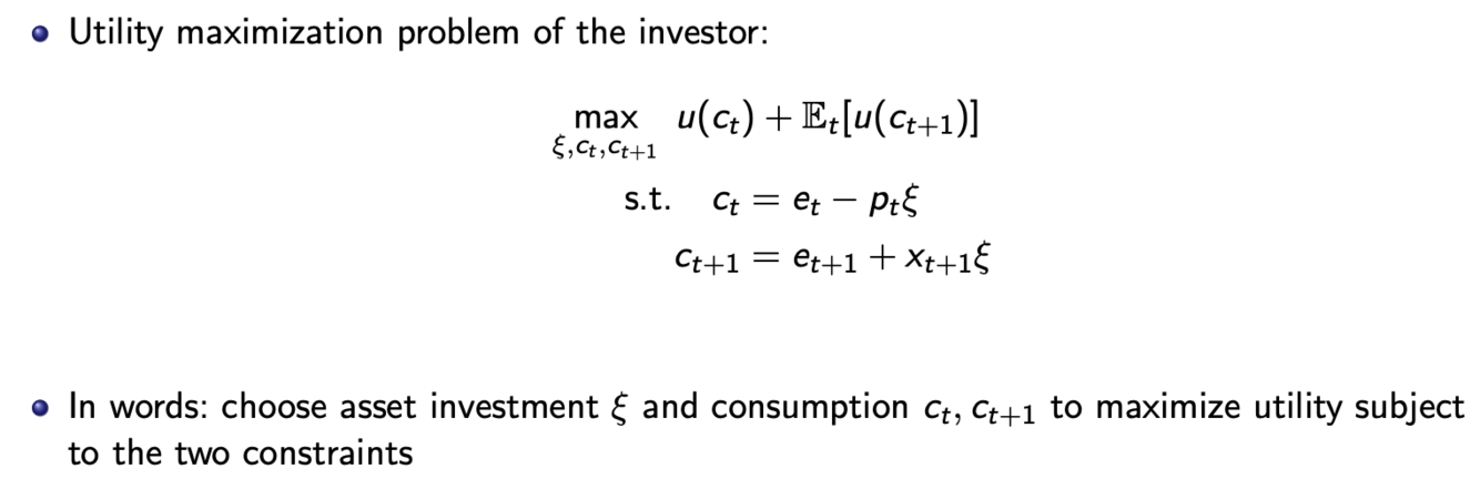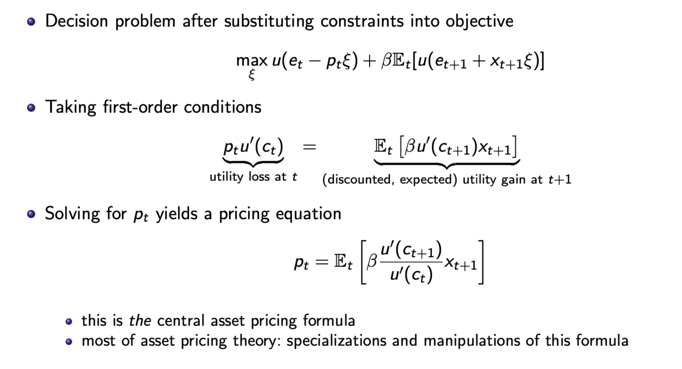 Most basic pricing equation is the first-order condition for that decision, equalizes marginal utility loss of consuming less today to buy more of the asset