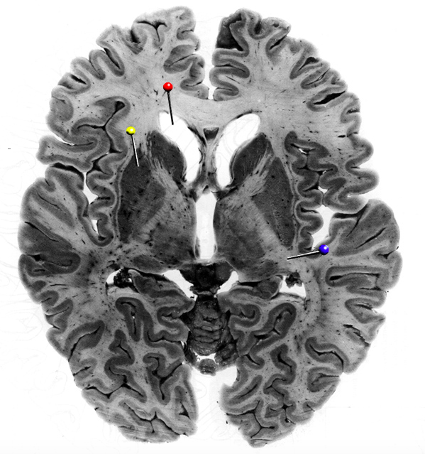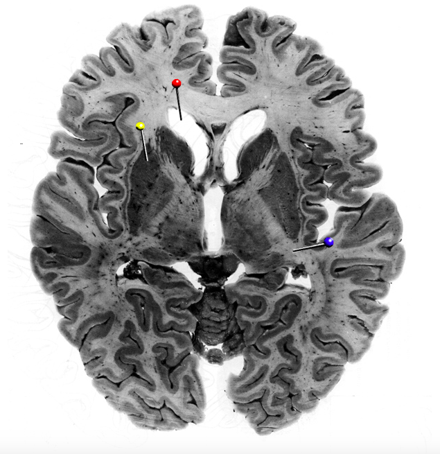 In this horizontal brain slice, the yellow pin is in