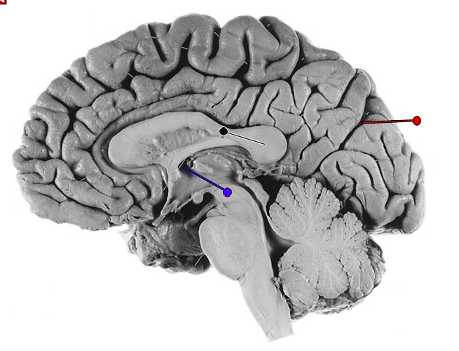 In this horizontal brain slice, the yellow pin is in the…