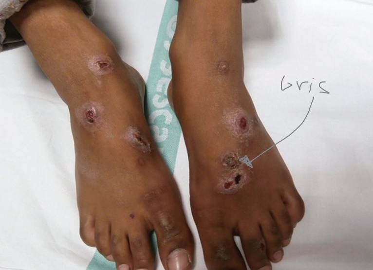 Produce una pápula, después se convierte a ulcera crónica ( NO cicatriza y esta cubierta por una membrana gris)