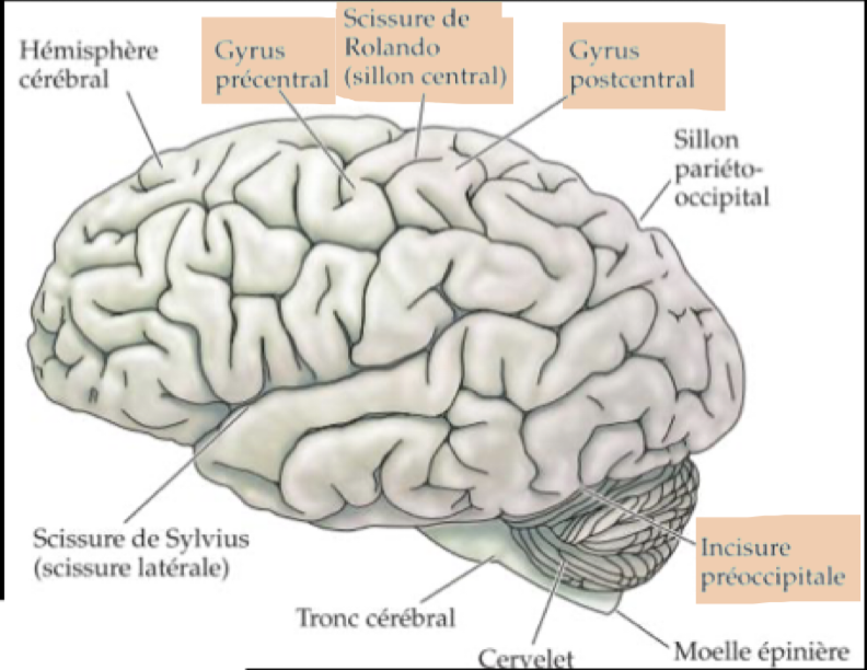 Regarder l'image (lobe frontal, lobe pariétal, gyrus précentral, gyrus postcentral, scissure de Rolando)