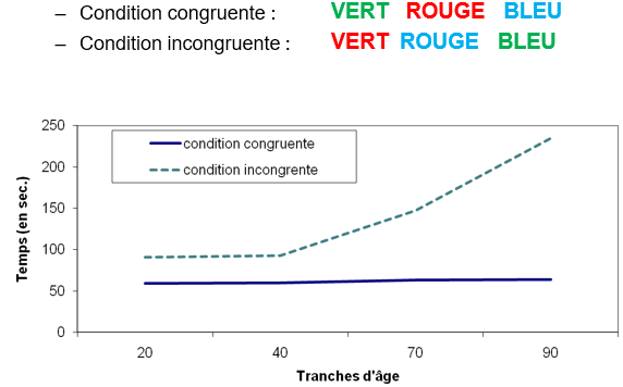 À partir de 40 ans, temps de réaction de + en + élevé pour condiiton incongruente, donc + de difficulté à inhhiber la réponse