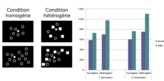 Résultats: les PA (vert) ont + de difficulté que les jeunes dans toutes les conditions. Mais aussi, ont + de difficulté p/r aux jeunes (mauve) dans condition hétérogène que homogène (l’écart entre les 2 groupes est + élevé pour condition hétérogène que pour condition homogène, que ce soit pour 7 ou 13 distracteurs)