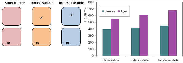 La différence entre les jeunes et les PA est + importante pour les indices valides et invalides que pour la condition contrôle (sans indice). —> l’ajout d’indices (qu’ils soient valides ou invalides) produit un coût supplémentaire pour les PA