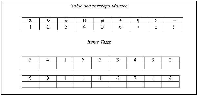 Épreuve des codes (WAIS) : chiffres de 1 à 9, chacun associé à un symbole. Doit remplir dans les cases le symbole qui correspond à chaque chiffre, le + rapidement possible