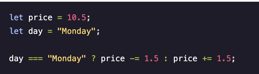 The ternary operator allows for a compact syntax in the case of binary (choosing between two choices) decisions. It accepts a condition followed by a ? operator, and then two expressions separated by a :. If the condition evaluates to truthy, the first expression is executed, otherwise, the second expression is executed.