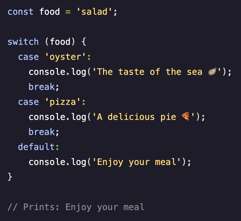 The case clause should finish with a break keyword. If no case matches but a default clause is included, the code inside default will be executed.