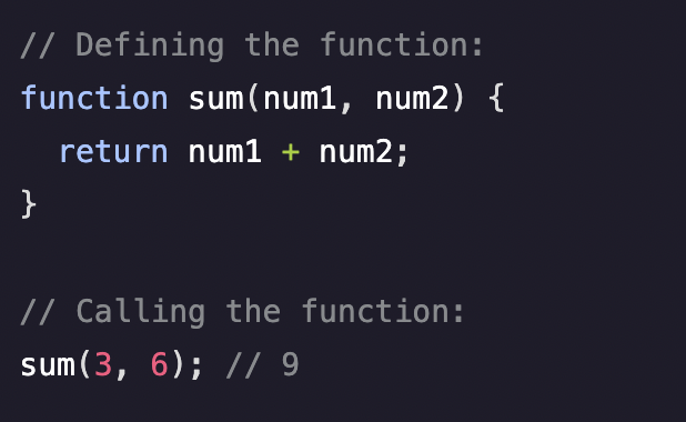 The example code provided contains a function that takes in 2 values and returns the sum of those numbers.