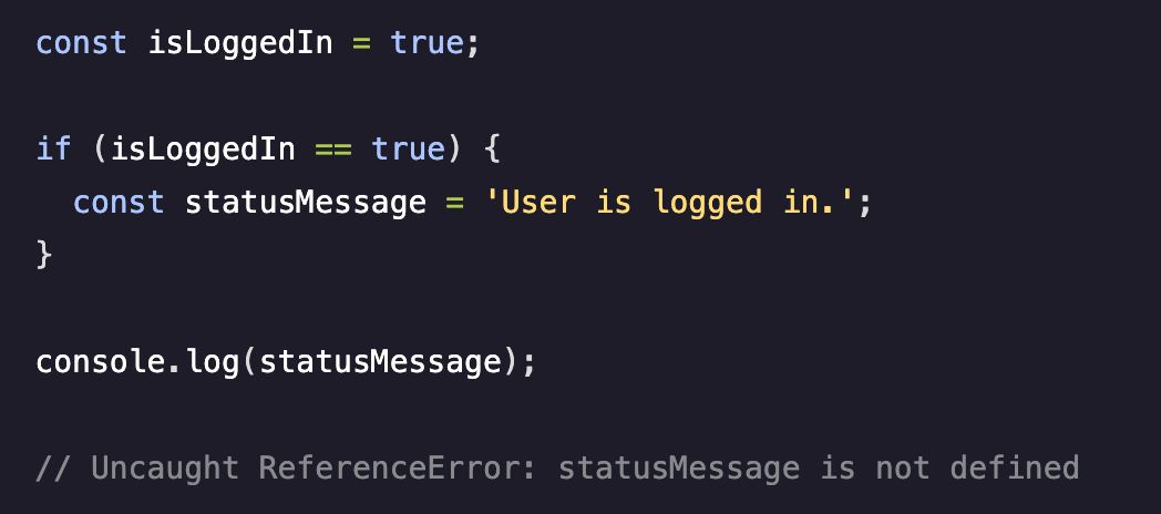 const and let are block scoped variables, meaning they are only accessible in their block or nested blocks. In the given code block, trying to print the statusMessage using the console.log() method will result in a ReferenceError. It is accessible only inside that if block.