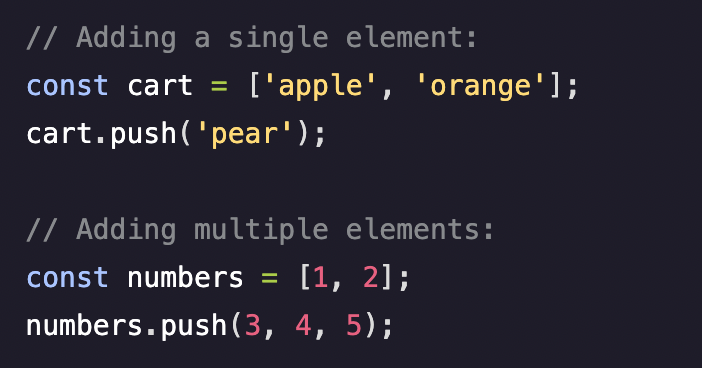 The .push() method of JavaScript arrays can be used to add one or more elements to the end of an array. .push() mutates the original array and returns the new length of the array.