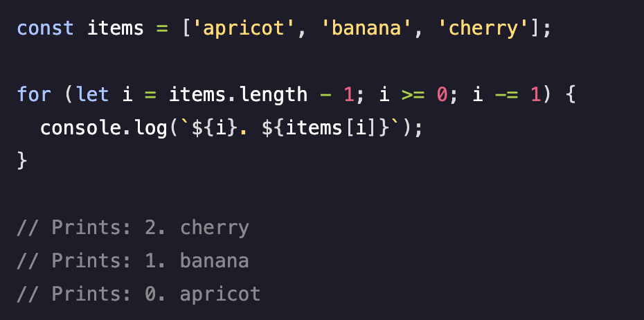 A for loop can iterate “in reverse” by initializing the loop variable to the starting value, testing for when the variable hits the ending value, and decrementing (subtracting from) the loop variable at each iteration.