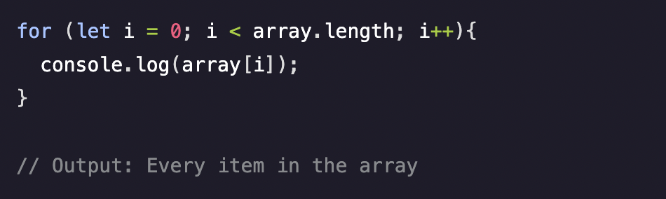 An array’s length can be evaluated with the .length property. This is extremely helpful for looping through arrays, as the .length of the array can be used as the stopping condition in the loop.
