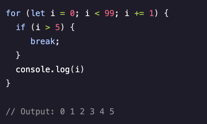 Here, the break keyword is used to exit the loop when i is greater than 5.