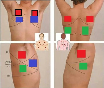 Lägg händerna symmetrisk över nedre delen av bröstryggen med tummarna på samma avstånd från ryggraden. Låt patienten andas och insepktera hur dina händer rör sig