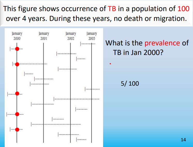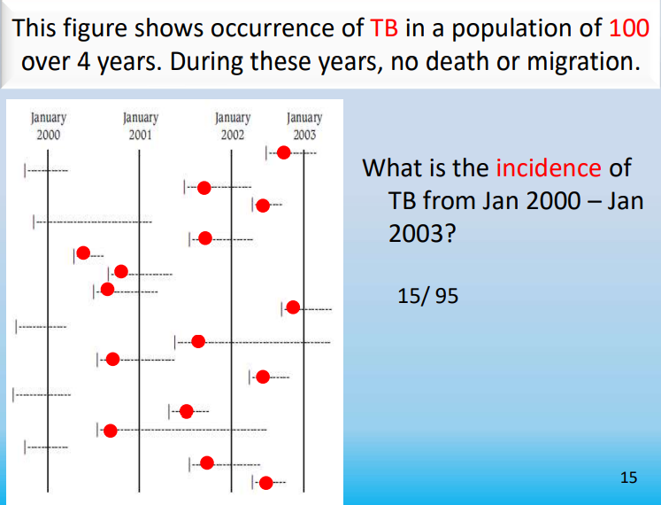 This figure shows occurrence of TB in a population of 100 over 4 years. During these years, no death or migration has occurred.