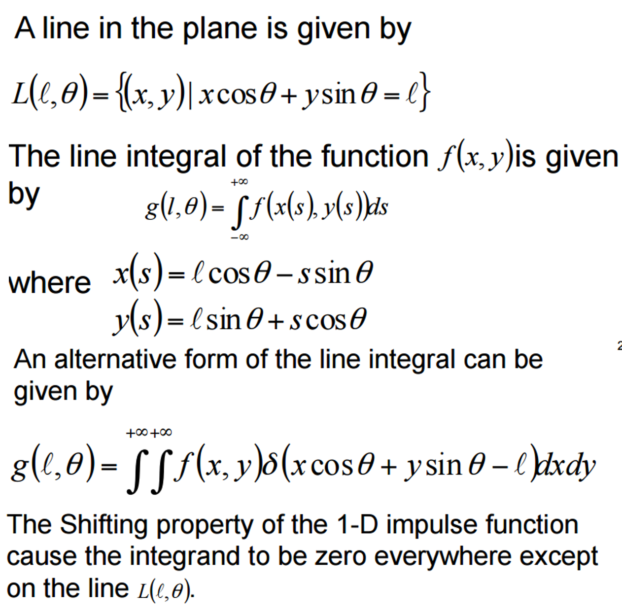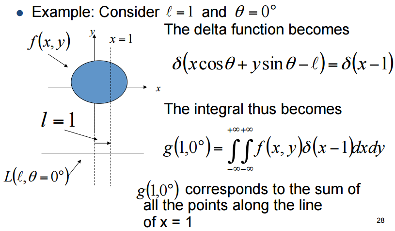 • Intuition tells us that if g(l,\theta) takes on a large value at \theta=\theta0, then f(x,y) must be large over the line L(l,\theta).