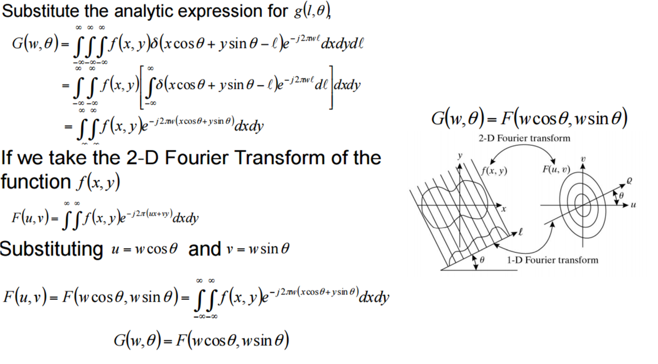 • The 1-D Fourier Transform of a projection equals a line passing through the origin of the 2-D Fourier Transform at an angle corresponding to the projection.