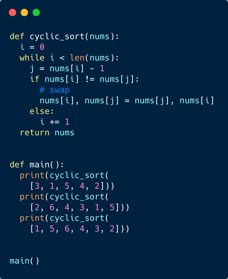 The time complexity of the above algorithm is O(n). Although we are not incrementing the index i when swapping the numbers, this will result in more than ‘n’ iterations of the loop, but in the worst-case scenario, the while loop will swap a total of ‘n-1’ numbers and once a number is at its correct index, we will move on to the next number by incrementing i. So overall, our algorithm will take O(n) + O(n-1) which is asymptotically equivalent to O(n).