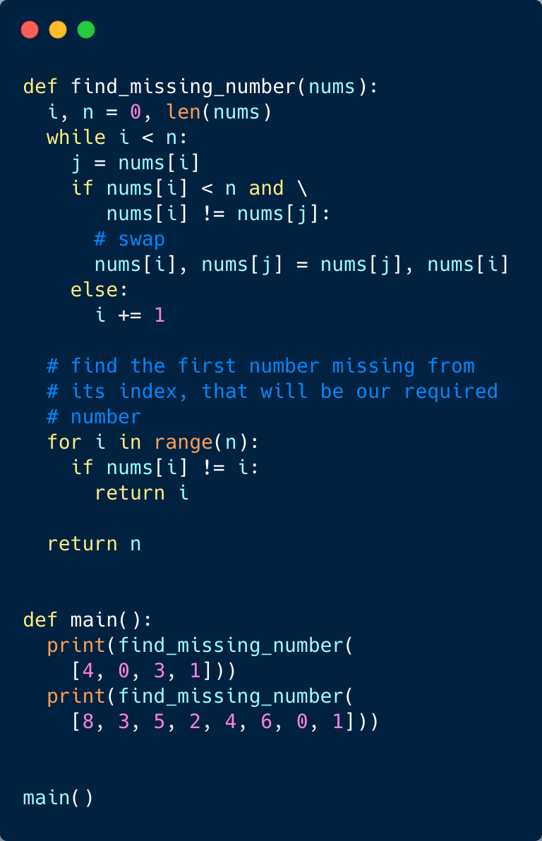 This problem follows the Cyclic Sort pattern. Since the input array contains unique numbers from the range 0 to ‘n’, we can use a similar strategy as discussed in Cyclic Sort to place the numbers on their correct index. Once we have every number in its correct place, we can iterate the array to find the index which does not have the correct number, and that index will be our missing number.