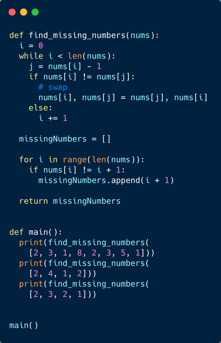 We will follow a similar approach as discussed in Find the Smallest Missing Positive Number to place the numbers on their correct indices and ignore all numbers that are out of the range of the array. Once we are done with the cyclic sort we will iterate through the array to find indices that do not have the correct numbers.