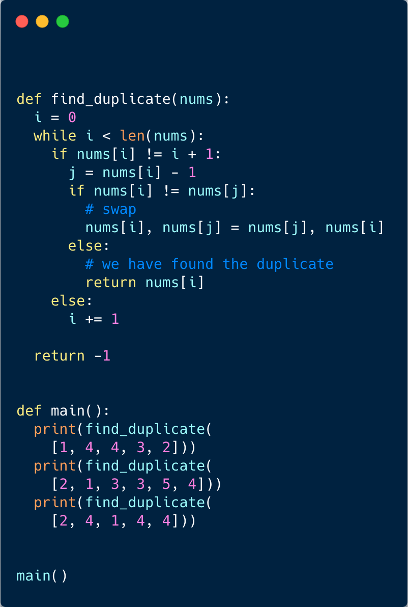 This problem follows the Cyclic Sort pattern and shares similarities with Find the Missing Number. Following a similar approach, we will try to place each number on its correct index. Since there is only one duplicate, if while swapping the number with its index both the numbers being swapped are same, we have found our duplicate!