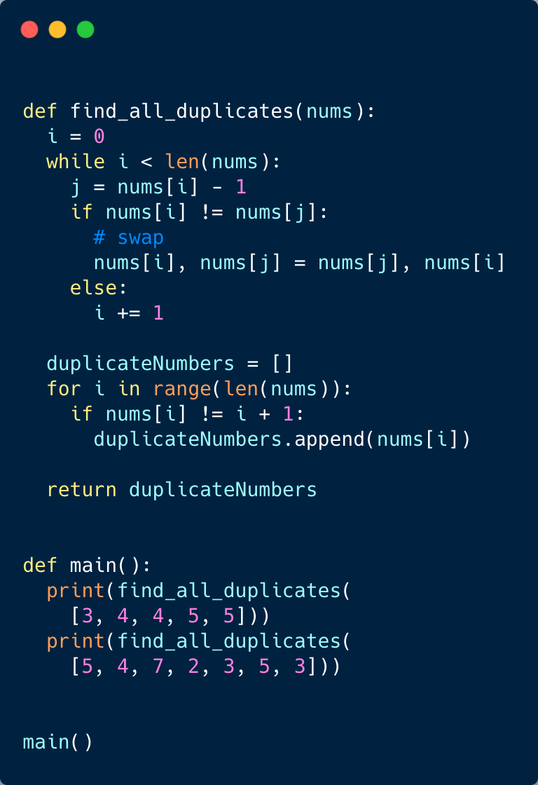 This problem follows the Cyclic Sort pattern and shares similarities with Find the Duplicate Number. Following a similar approach, we will place each number at its correct index. After that, we will iterate through the array to find all numbers that are not at the correct indices. All these numbers are duplicates.