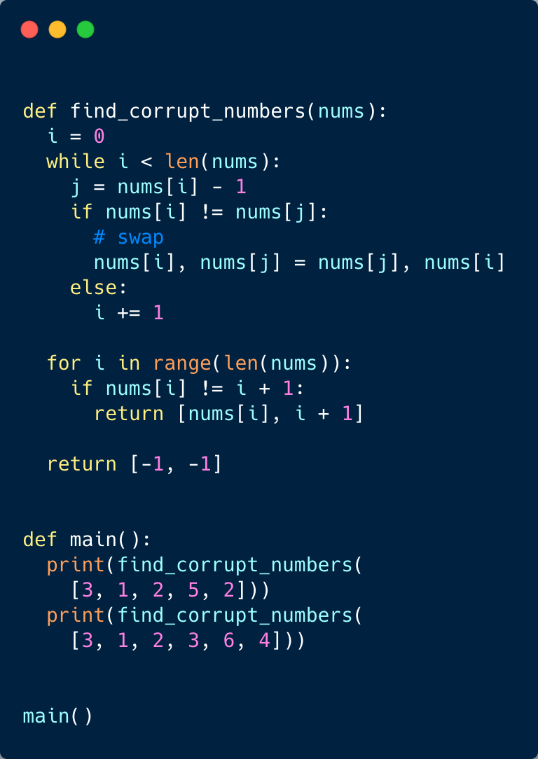 This problem follows the Cyclic Sort pattern and shares similarities with Find all Duplicate Numbers. Following a similar approach, we will place each number at its correct index. Once we are done with the cyclic sort, we will iterate through the array to find the number that is not at the correct index. Since only one number got corrupted, the number at the wrong index is the duplicated number and the index itself represents the missing number.