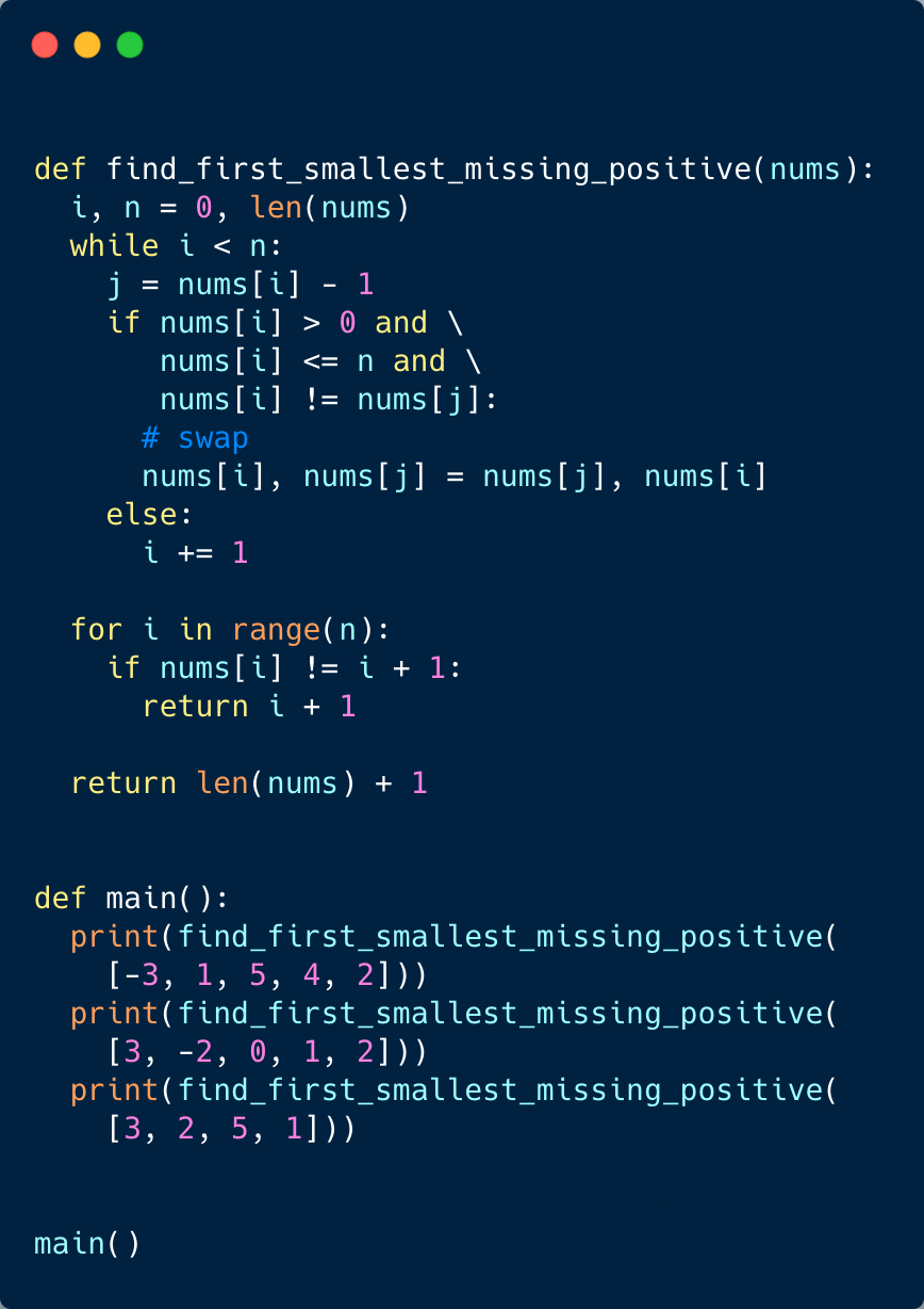 However, we will follow a similar approach though as discussed in Find the Missing Number to place the numbers on their correct indices and ignore all numbers that are out of the range of the array (i.e., all negative numbers and all numbers greater than or equal to the length of the array). Once we are done with the cyclic sort we will iterate the array and the first index that does not have the correct number will be the smallest missing positive number!